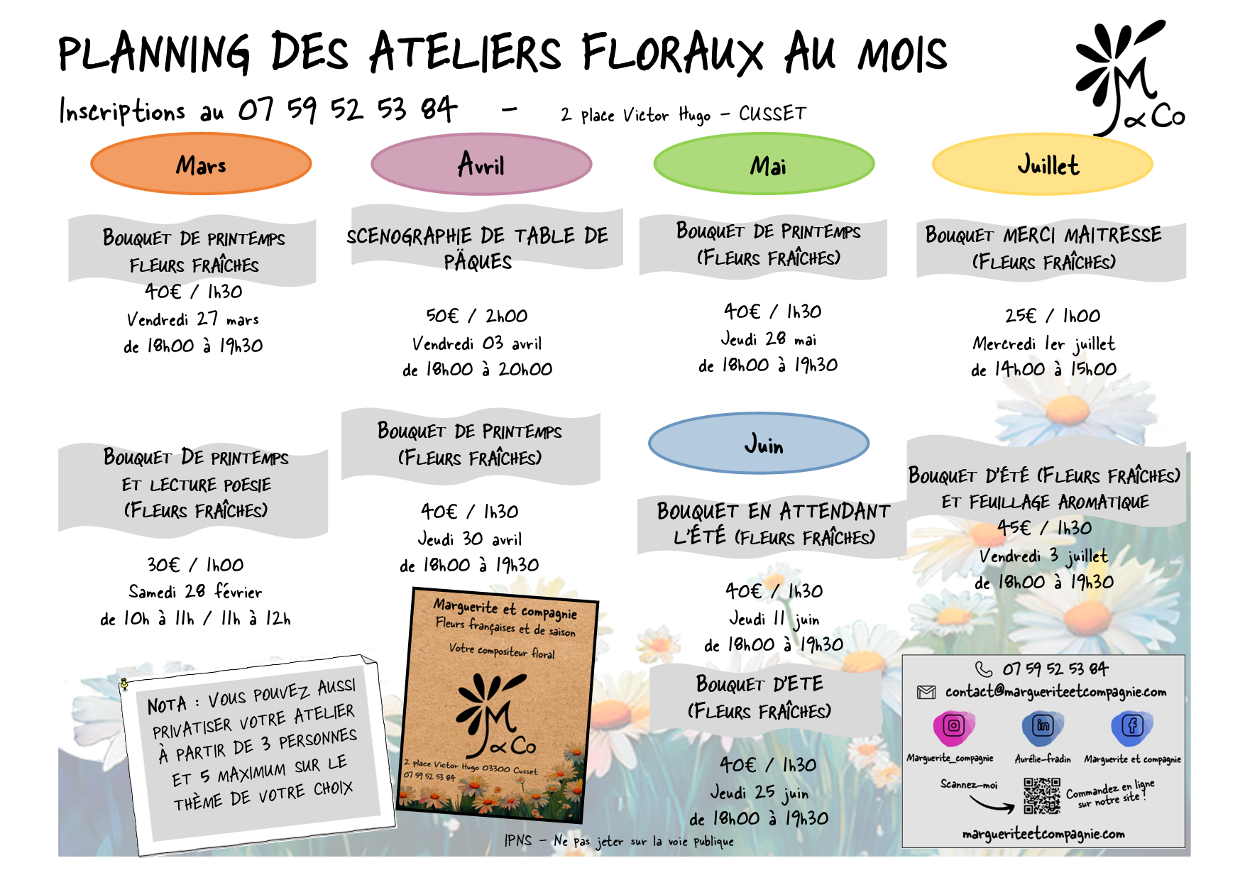 Le calendrier de nos ateliers, maximum 5 participants, matériel fourni :